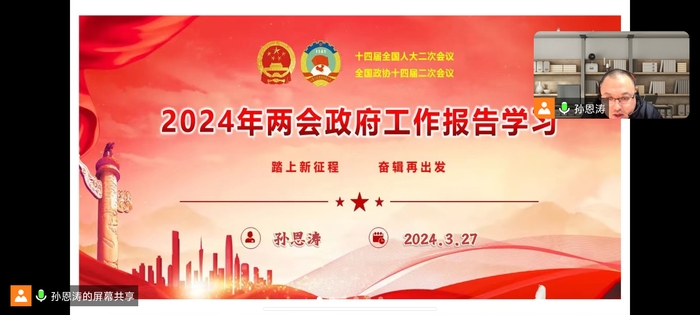 为进一步提高党员的思想觉悟和政治理论水平,3月27日晚,英国365集团官网党委邀请校“十佳教师”、公司党委委员孙恩涛在线上开展2024年全国“两会”政府工作报告学习会,公司全体党员参加。