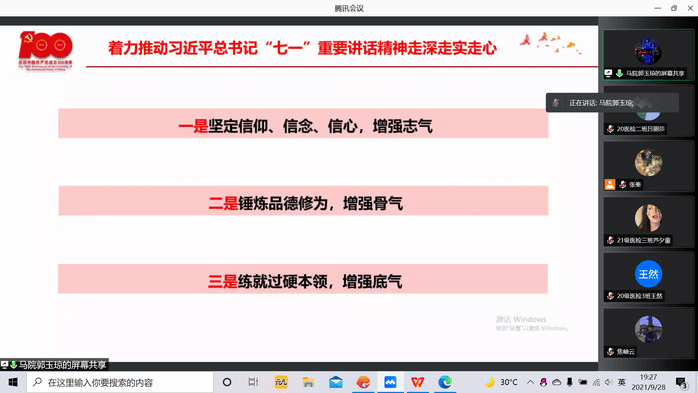 为深刻认识、准确把握习近平总书记“七一”重要讲话精神,深入解读中国共产党百年奋斗的光辉历程、伟大成就、宝贵经验、实践启示,以及伟大建党精神的深刻内涵和时代价值,9月28日晚,公司邀请马克思主义公司郭玉琼副教授,通过腾讯会议的方式作“七一”重要讲话精神专题宣讲。本次宣讲会由英国365集团官网团委副书记张秦主持,2019级、2020级全体员工参加。
