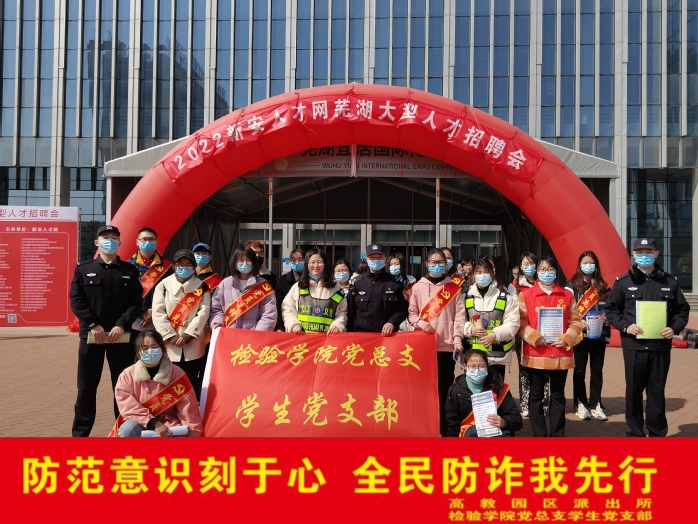为深入学习贯彻党的十九大、十九届六中全会精神,不断巩固拓展党史学习教育成果,强化员工党员服务意识,提高人民群众反诈防诈意识和能力,预防和减少电信诈骗案件发生,2月27日上午,公司党总支员工党支部联合高校园区派出所共同前往芜湖人才招聘会会场——芜湖市国际会展中心,开展“防范意识刻于心,全民防诈我先行”主题党日活动。