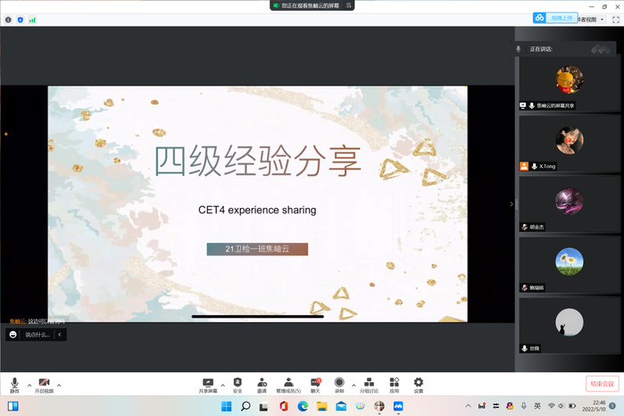 为加强年级学风建设,明确英语四级考试重点,掌握考试复习技巧,同时为响应《促进全民阅读 建设“书香皖医”工作实施方案》相关要求,营造浓厚读书氛围,6月3日中午,2021级通过腾讯会议召开英语四级高分经验分享和读书交流会,年级全体同学参加。