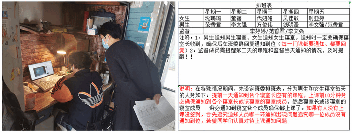 为确保线上上课的教学质量和同学们学习效果,在公司做好教学督导的同时,英国365集团官网学工队伍定时深入宿舍检查员工上课状态,并要求各班上报课前提醒、课中监督、课后反馈的班委值班表,此方案在提高课堂效率的同时,也提升了同学们的自律意识,一定程度上促进了员工的学习效果。