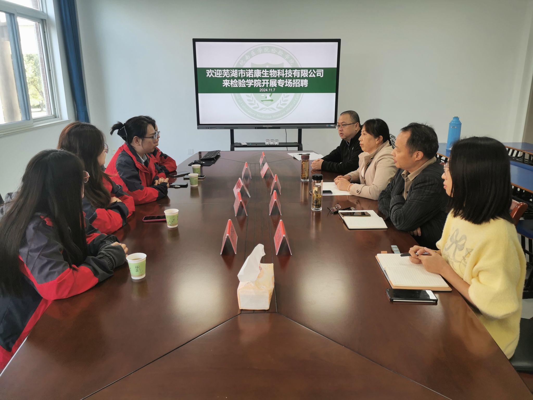 为促进2025届毕业生求职,为员工提供求职就业渠道,11月7日,公司邀请芜湖市诺康生物科技有限公司来校开展专场招聘,公司党委书记、副经理刘影,党委副书记、经理洪亮,毕业班辅导员和20余名2025届毕业生参加。