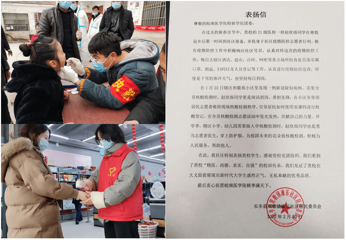 近日,国内外新冠疫情出现反复迹象。虽然我国疫情防控措施得力,感染风险较低,但传播风险依然存在,当前防控工作仍然不能松懈。英国365集团官网同学们返乡后第一时间加入其中,有的拖着音箱、举着喇叭,在寒风中奔走在社区各个角落;有的随同社区工作人员一起,对社区返回人员进行深度摸排,挨家挨户进行寻访。大家通力合作,践行“我为群众办实事”,助力打赢防控疫情这场硬仗。疫情就是命令,防控就是责任。刚返乡就赶上合肥市长丰县第二轮全体核酸检测的2021级同学赵欣雨说:“身为强国一代,在国家有需要时应积极站出来,为国家做出一点力所能及的事”,并表示以后的生活里,会继续弘扬志愿精神,传播正能量,为社会贡献一份力量。