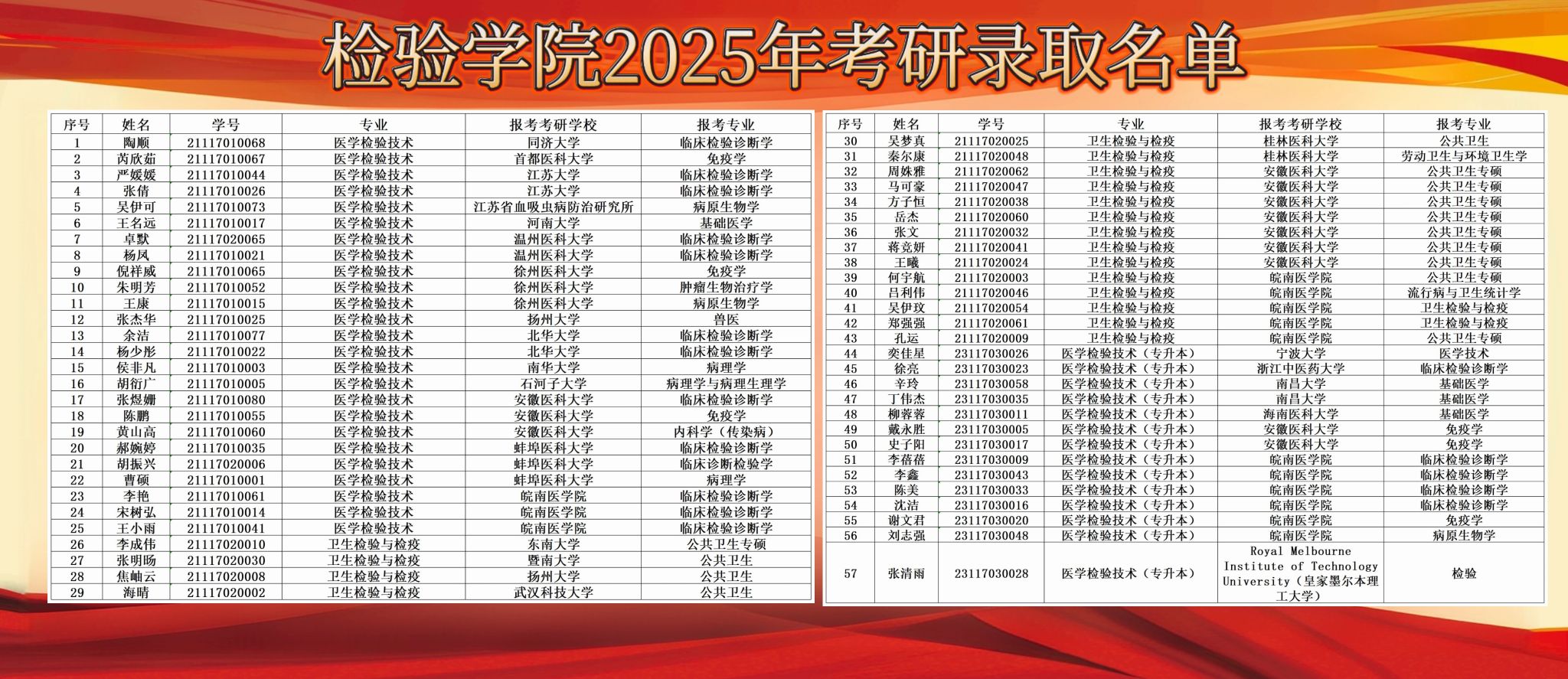 随着4月30日考研调剂系统的关闭,2025年研究生复试工作全面结束。2025届186名毕业生中,共考研拟录取57人,包括境内升学56人、境外留学1人,升学率达30.65%,再创升学率新纪录。其中,2021级医学检验技术专业升学率为31.65%、2021级卫生检验与检疫专业升学率为38.30%、2023级医学检验技术(专升本)专业升学率为23.33%,均为历史升学率最高纪录。