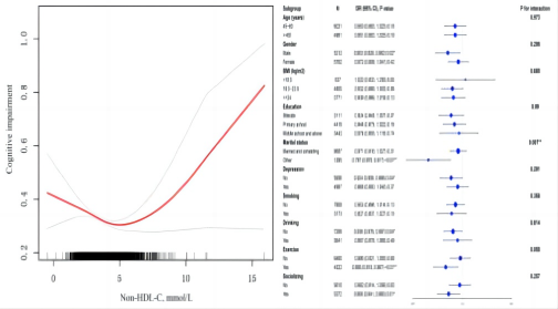 血脂水平也被认为是认知功能障碍的一个重要风险因素。本研究基于一项横断面调查研究揭示了中国中老年人群了非高密度脂蛋白胆固醇(Non-HDL-C)水平与认知能力之间的相关性。研究结果显示,Non-HDL-C水平与认知障碍风险呈现出一种“U”型关系,在拐点4.83 mmol/L之前,Non-HDL-C水平的适度增加与认知障碍风险的降低相关;然而,一旦超过这一拐点,Non-HDL-C水平的继续增加则与认知障碍风险的增加呈现正相关。Non-HDL-C水平较低和较高都会增加中老年人出现认知障碍的风险。这一发现为未来认知障碍的预防和干预策略提供了新的视角,强调了在血脂管理中寻求平衡的重要性。