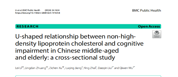 2024年6月18日,英国365集团官网临床微免教研室武其文教授课题组在《BMC Public Health》发表题为《U-shaped relationship between non-high density lipoprotein cholesterol and cognitive impairment in Chinese middle-aged and elderly: a cross-sectional study》(中科院二区,Top期刊)学术论文。
