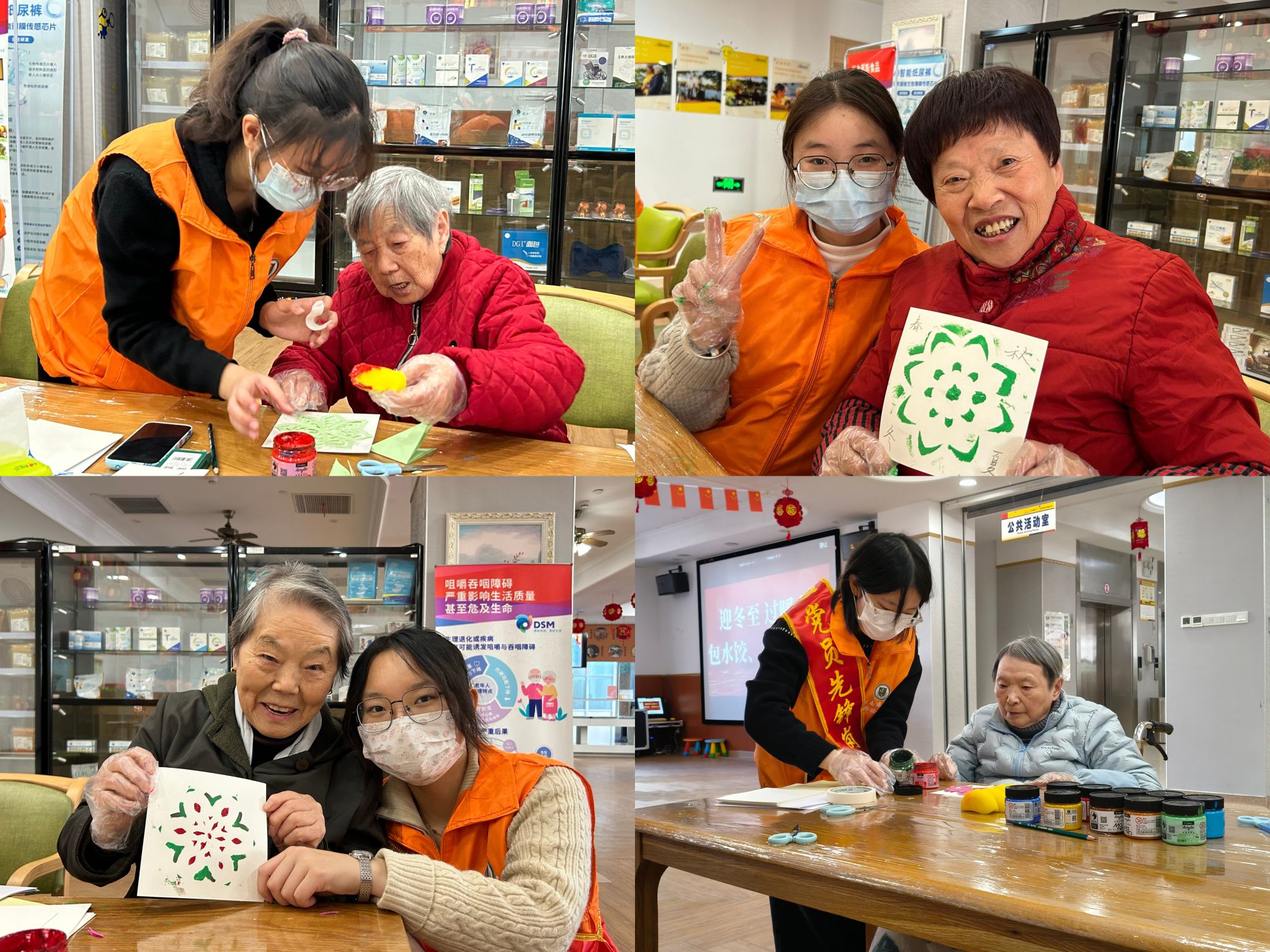 一场别开生面的剪纸拓印活动也在这个闲适的午后温馨上演。一幅幅寓意吉祥、形态各异的剪纸拓印作品逐一呈现,从象征吉祥的团花,到寓意冬至的雪花,每一件作品都凝聚了老人们对美好生活的向往与祝福。临近剪纸活动结束,一位奶奶将拓印作品送给了志愿者,感谢志愿者今天下午的陪伴。