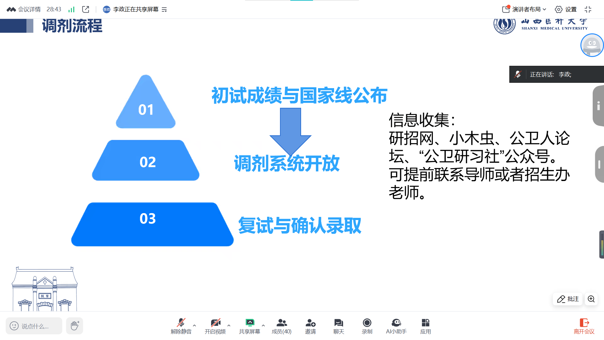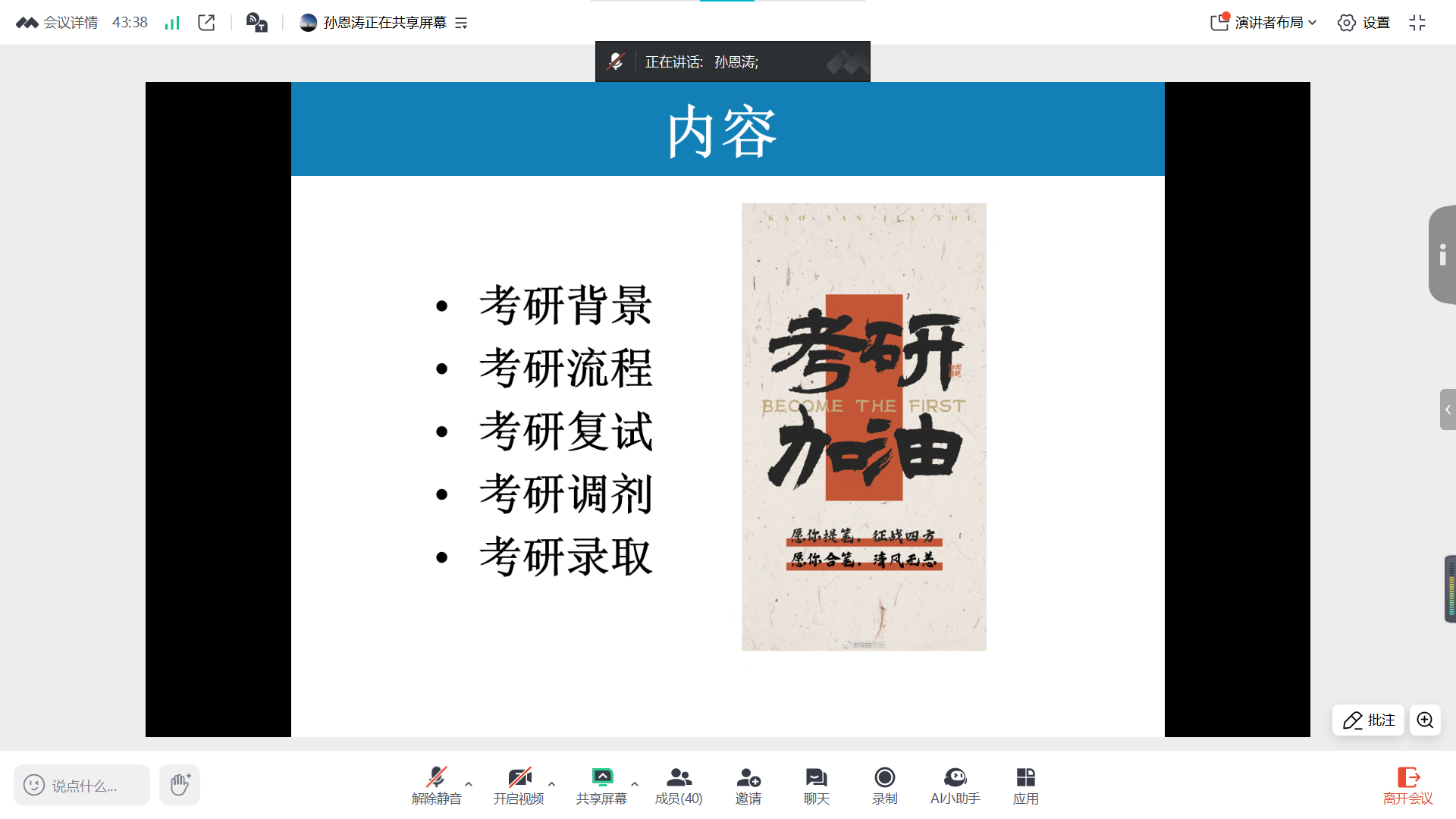 孙恩涛从研究生导师的独特视角,为同学们提供了宝贵的建议。他指出,考研过线的同学都有机会入学深造,高分段的同学应全力保住第一志愿;成绩在国家线附近的同学不可轻易放弃,要综合考虑调剂院校和专业;落榜同学也不要气馁,应认真分析原因,做好自我评估,就业之后也可以继续考研。并通过举例和大家交流了考研复试过程中坚持之后的成功。