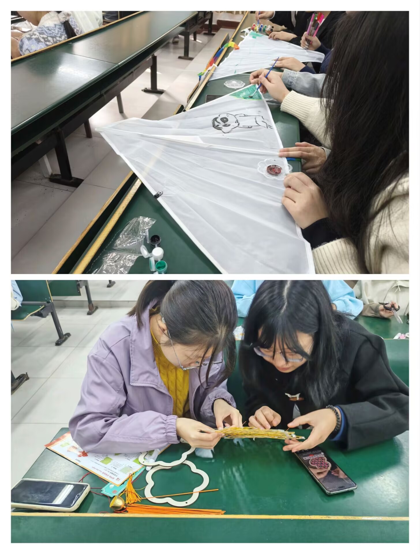 活动现场分设两大特色板块,各环节衔接有序、异彩纷呈。制作风筝组的同学围绕茱萸、菊花、寿桃等重阳经典元素展开创作,现场氛围融洽热烈,绘画过程中,同学们时而俯身调色,时而交流技法,遇到瓶颈时相互点拨,灵感迸发时默契配合,颜料在指尖流转,创意在筝面汇聚,原本空白的风筝逐渐被赋予鲜活的重阳意蕴;制作风铃的同学在图纸教程的指引下,从打磨木片边缘的细致操作,到搭配彩绳配色的巧思设计,从固定铃铛的精准拿捏,到调整挂饰平衡的反复调试,同学们耐心钻研、互帮互教,指尖翻飞间,一个个兼具古朴韵味与青春气息的风铃渐次成型,清脆铃声与欢声笑语交织成趣。