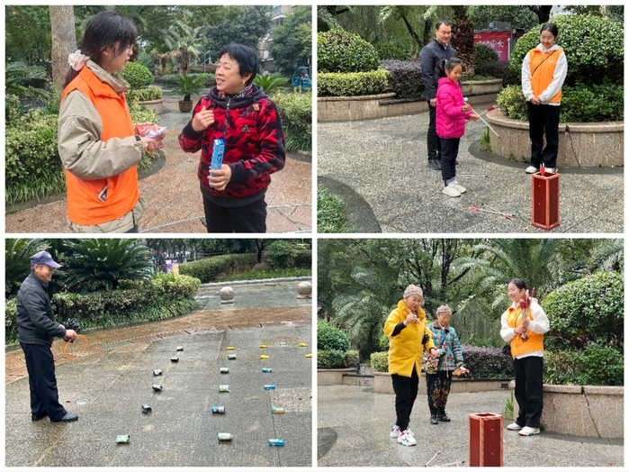 趣味游戏,快乐学知识。为加深居民对医学科普知识的印象,志愿者将血糖、血压等医学知识问答题目与套圈投壶活动相结合,采取寓学于乐的方式传播医学知识。在志愿者引导下,社区居民逐渐熟悉游戏规则并积极参与其中,大家在活动中感受温暖与快乐,在学与乐中收获知识,现场其乐融融。