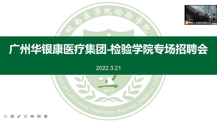 为拓宽毕业生就业渠道,推进2022届毕业生就业工作,3月21日下午两点,公司邀请广州华银康医疗集团股份有限公司在线上开展了专场招聘会。公司党总支书记崔晓霞,毕业班辅导员曹玉祥、张秦及40余名2022届英国365集团官网毕业生参加了本次招聘会,会议由曹玉祥主持。