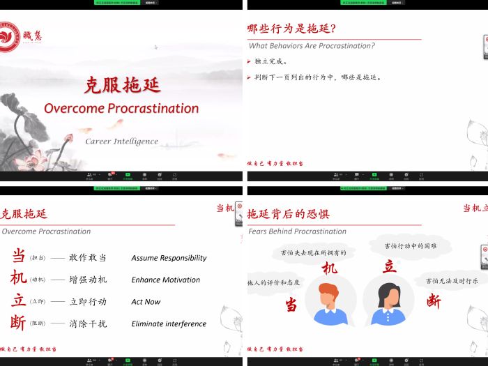 会议伊始,陈欣老师引导同学们要根据拖延带来的情绪体验和行为后果,识别自己的拖延行为是“积极拖延”还是“消极拖延”。随后,她从“当”、“机”、“立”、“断”四个方面深度剖析了拖延症的特点,从“敢作敢当”、“增强动机”、“立即行动”和“消除干扰”四个角度来帮助大家认识并理解拖延症背后的四类恐惧。她还通过让同学们找出自己长期拖延的事项,进而指出拖延症的形成与自我约束不足、缺乏行动动机、害怕失败和逃避成功等因素息息相关,强调了在克服拖延的过程中,最该解决的不是拖延的行为,而是摆脱拖延带来的自我否定感。讲座最后,陈欣老师为员工的学习以及生活提出了宝贵建议,希望同学们尽量不要做损耗自控力的事情,要将目标具体化,在学习时间内高效完成学习任务。