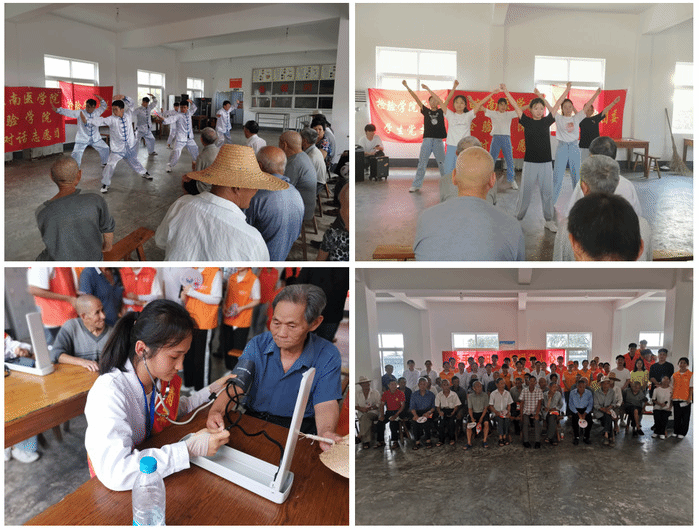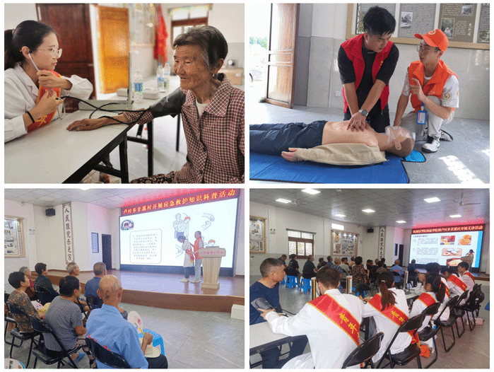 上午8时,首先进行了“义诊进社区,共创新时代”活动。志愿者们为村民们测量血压,咨询身体健康状况,告诉他们健康饮食相关知识,并嘱咐高血压患者按时吃药,举手投足间无不流露出关爱与呵护。紧接着,大礼堂开展了 “三高预防”、“急救知识”和“生物防治”等主题宣讲,旨在提高村民们的健康意识和应对突发状况的能力。对于村民的疑惑,志愿者们也尽己所能为村民们解答,志愿者们耐心地讲解得到了村民们的一致好评。