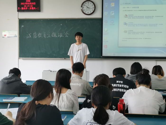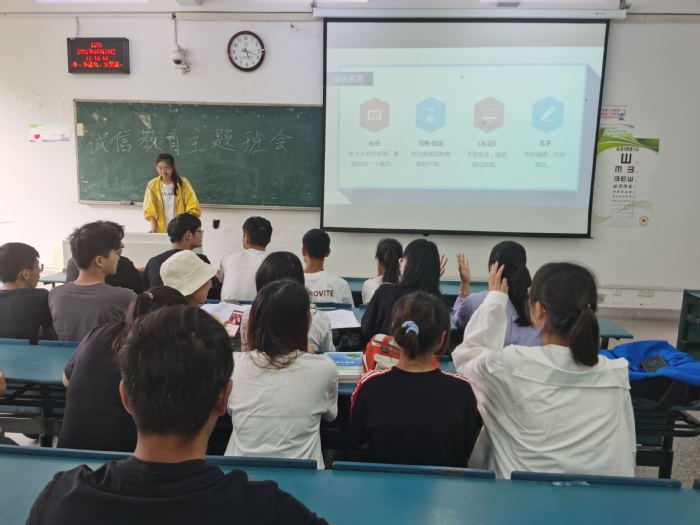 活动伊始,以班级为单位,各班开展主题班会。班长借助PPT从诚信的定义、具体内容和老员工行为准则三方面向同学们介绍了诚信教育相关内容,深入剖析了当代老员工不诚信、不守规矩约定的现象与原因。随后通过播放相关真实案例视频,加深了同学们对诚信的认知。部分班级在此次活动中还号召同学签署诚信考试承诺书,规范自身行为,端正考试态度,杜绝考试作弊现象。同学们纷纷表示对此次活动感受颇深,并将严格要求自己,努力做到诚实待人、信守承诺。