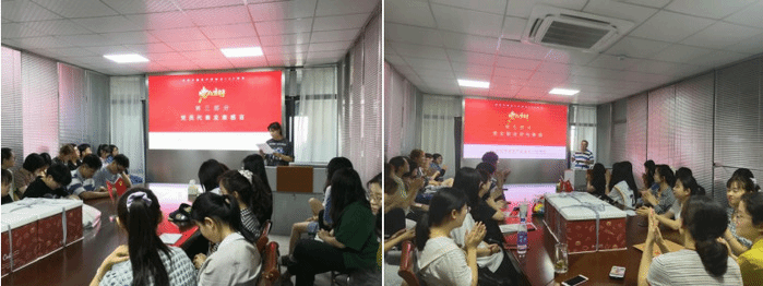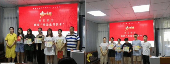 教工党支部书记孙恩涛、员工党支部书记陶善珺和员工党支部委员曹玉祥、张秦为十六名员工党员颁发“政治生日”贺卡,——献上热情洋溢、语重心长的特别祝福。之后,全体党员同志观看2017级,2018级员工党员拍摄的祝福视频并许下政治生日愿望,分发政治生日蛋糕。