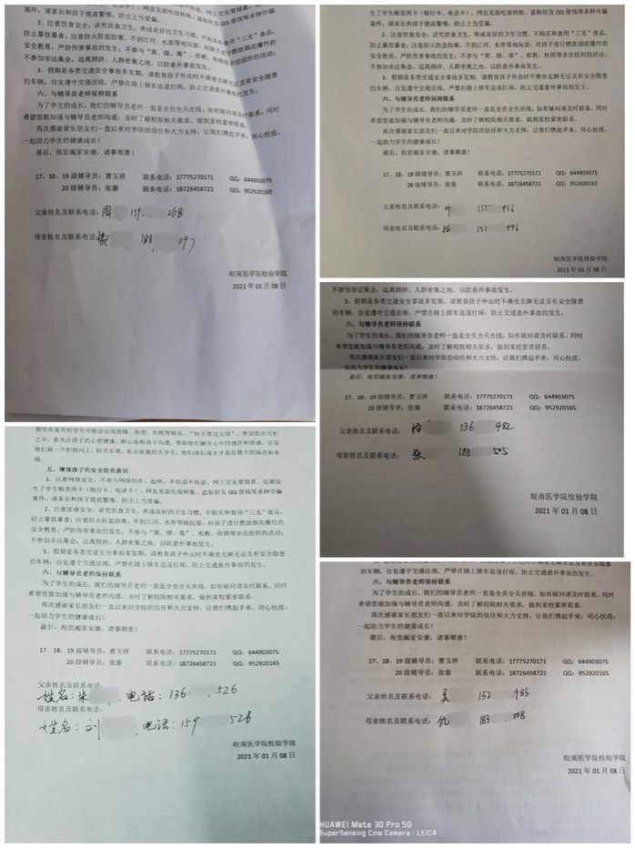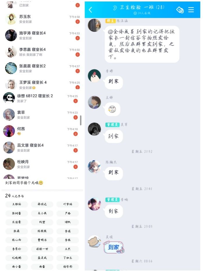 2021年1月12日,辅导员张秦在3301教室召开年级大会,20级全体同学参加。大会上,张秦从疫情防控、人身财产、交通安全、宿舍安全、宗教意识形态五个方面,列举了安全事故的危险性,并根据存在的安全问题提出了解决方案和防范措施。会后,组织所有员工填写假期行程登记表。1月16日正式放假,安全到家的同学将已签署的《致家长的一封信》拍照上传至班群,并打卡报平安。