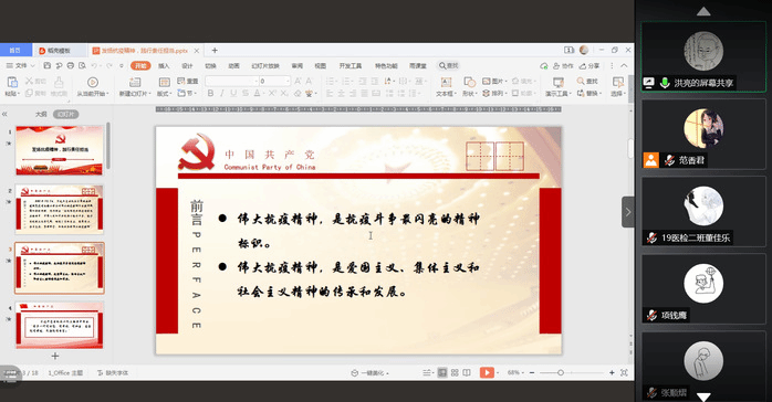下午,在腾讯会议上进行了以“弘扬抗疫精神,践行责任担当”为主题的党校培训。洪亮首先讲述了“抗疫精神”的含义,点出中华民族的伟大抗疫精神是中国打胜这场新冠疫情的原因。又分别从“为什么”、“是什么”、“怎么做”三个方面讲述了新时代青年同责任意识与担当精神的关系。最后就此话题表达了对同学们的期许,愿同学们能早日加入党组织为实现我国现阶段的宏伟目标做好准备。