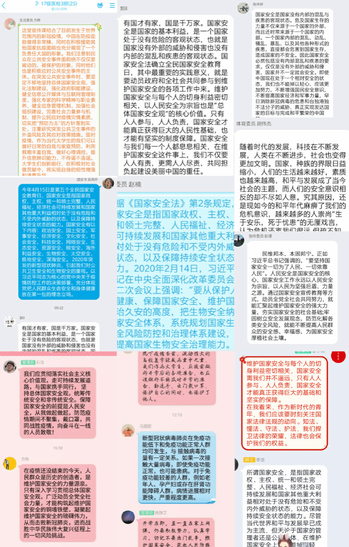 2020年4月15日是第五个全民国家安全日,2017级紧扣“坚持总体国家安全观,统筹传统安全和非传统安全,为决胜全面建成小康社会提供坚强保障”为主题,通过“云”班会、向全体员工和员工党员开展了一系列国家安全教育宣传活动。