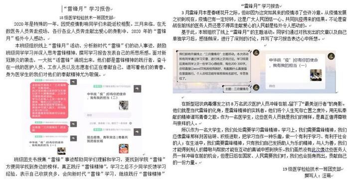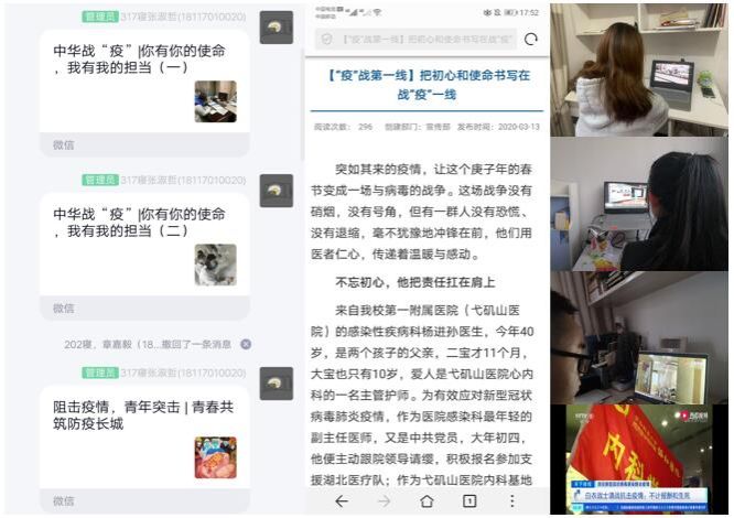 新型冠状病毒疫情爆发以来,无数党员和先进工作者主动请缨前往防疫第一线,用生命坚守岗位,尽己所能救死扶伤,他们是最美的“逆行者”。这里面不乏有公司第一附属医院和第二附属医院的优秀医护人员,同样也有公司甚至公司毕业的优秀毕业生。同学们均被“逆行者”的大爱情怀、忘我精神所感动,纷纷表示在此后的学习与工作中,不忘初心牢记使命,勤奋学习,做一名合格的医员工。团委书记曹玉祥强调,雷锋精神不仅仅有抗疫英雄轰轰烈烈的大美逆行,还应该是每个平凡人肩负的责任和担当。青年团员向抗疫英雄致敬,在疫情期间要严格要求自己,主动应对学习方式转变带来的不适,主动融入空中课堂,主动完成课上作业,主动打卡汇报行程变化,做到学习、防疫两不误,用实际行动守望春暖花开。