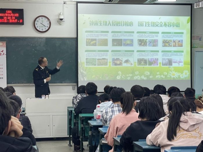 讲座中,同学们积极参与扫码问答活动,海关科长先裕飞根据问卷的作答情况为大家介绍海关工作。随后,他结合实际案例为同学们宣讲了国门安全知识,讲述了埃博拉病毒、塞卡病毒等病原微生物造成的危害及水葫芦、美国白蛾等外来物种的入侵,并通过展示新出台的有关生物安全法律法规来突显国家对生物安全的重视。讲座结束之际,为解决部分同学的疑问,先裕飞结合个人工作经历,从专业的角度进行详细解答,同时勉励同学们在今后的学习、生活、工作中,坚持以进取的心态和创先争优的精神努力学习,为祖国生物安全事业做贡献。