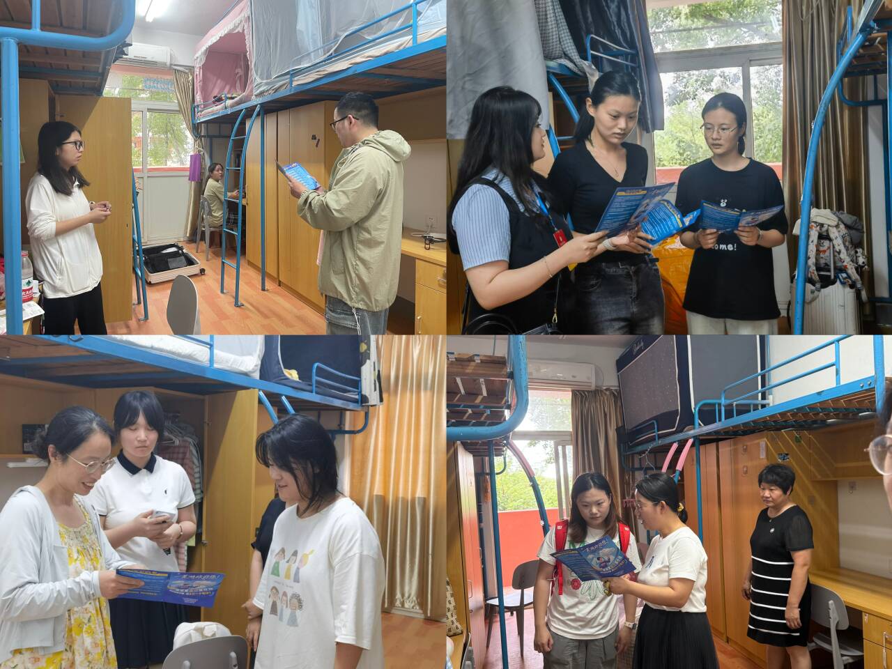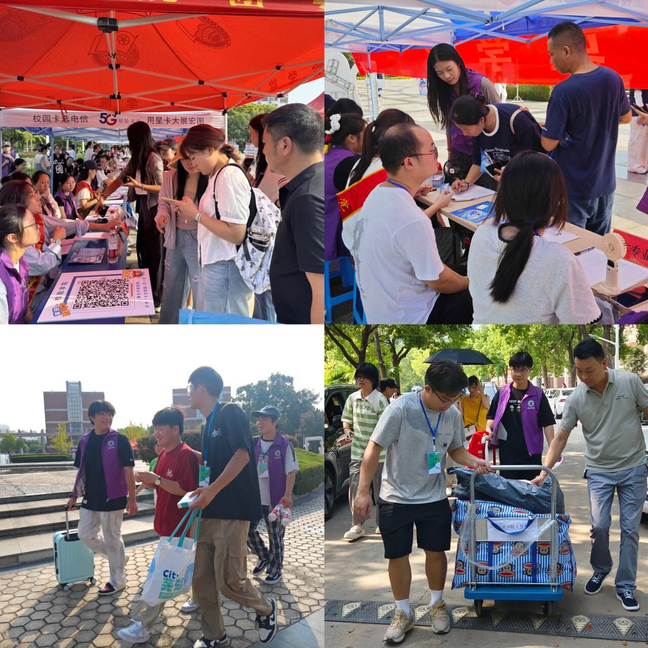 在滨江校区(南区)主干道和宿舍区域,除了员工志愿者协助搬运行李、介绍校园设施和分享生活经验外,党员教师也深入宿舍开展防范电信诈骗宣传,帮助新生提升安全意识和自我保护能力。