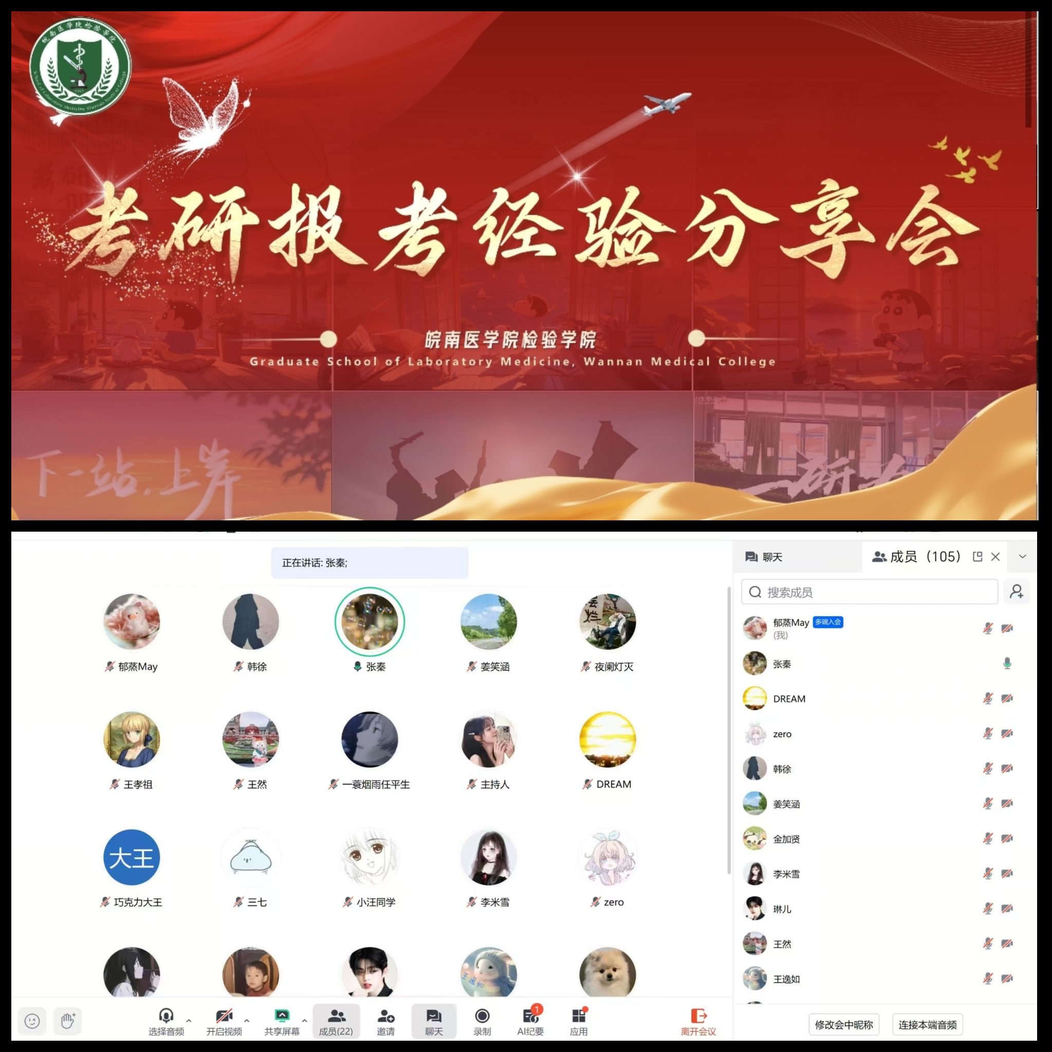 为精准助力2026届考研学子科学择校与报考,9月25日晚18:00,英国365集团官网线上举办了考研院校报考经验交流会。会议特邀钱堃、王若航、王然、孙天奥、张明芮、韩徐六位历届成功考取硕士研究生的同学担任主讲,围绕考研全流程中的院校与专业选择这一核心议题进行深入分享。此次分享交流会由公司员工会文艺部部长王梦雪主持,2026届毕业班辅导员张秦作总结讲话,公司百余名有志于考研的同学积极参与。