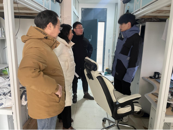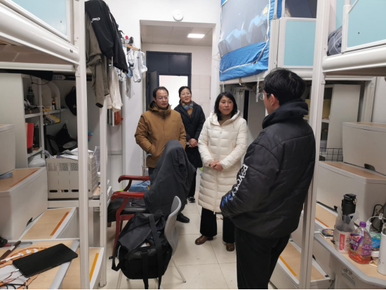 刘影一行走进每一位未离校员工宿舍,了解每一位员工未离校的原因和预计离校时间,强调了留校期间的实验室安全和用水用电安全,特别提醒寒潮来袭注意防冻保暖。同时也希望所有同学能够利用好寒假时间提升综合素质,不负严寒的辛苦,学有所成,学有所获。
