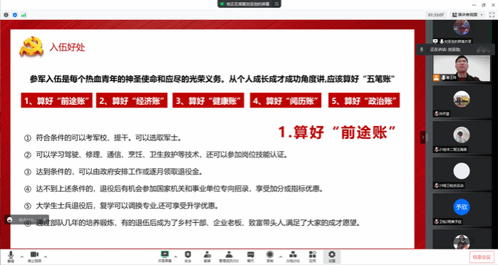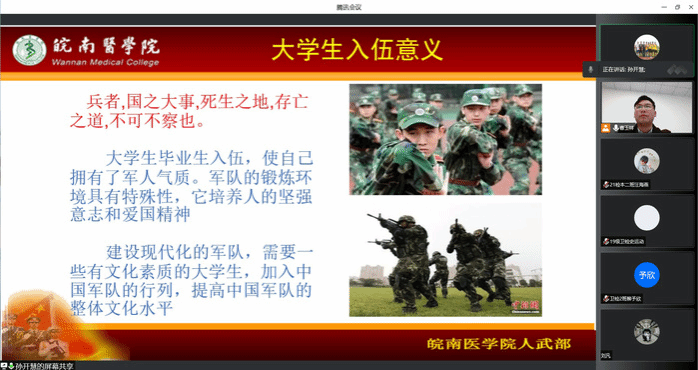 筑梦军旅,强军报国;投笔从戎,青春无悔。为响应党和国家号召,积极宣传征兵入伍政策,鼓励大学毕业生参军入伍报效祖国,英国365集团官网于3月5日下午线上举办毕业生征兵入伍政策宣讲会。本次宣讲会邀请员工处国防教育科科长孙开慧和2022级医学检验技术专升本专业退役员工刘亚劲进行宣讲,2023届全体毕业生和辅导员参会。会议由毕业班辅导员曹玉祥主持。
